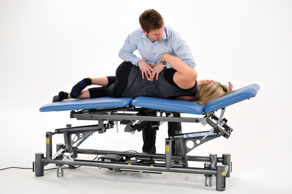 The optional Adjustable Center Section allows for passive placement of the lumbar spine into flexion, extension, or side flexion. This feature enables accurate positioning for spinal mobilization/manipulation, soft tissue mobilization, muscle energy techniques, and muscle stretching techniques. In addition, this feature can also be utilized with deep tip postural drainage, as well as providing a supported position for gravity pendular treatments with the assistance of a powered actuator, which can be controlled by either a handheld or foot pedal device.